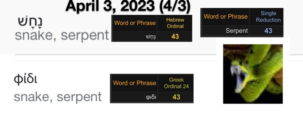 (Snake/Serpent) נָחָשׁ = 43 Hebrew Ordinal. φίδι (Snake/Serpent) = 43 Greek 24