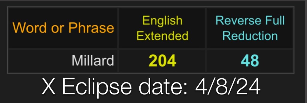 But wait there’s more… there are other strong and often used ciphers. The Reverse Full Reduction and Extended aka “Standard” ciphers are definitely up there. Millard sums to 48 RFR (4/8) and 204 (‘24) Extended. Considering Millard is from Carbondale, that would be an amazing coincidence to chalk it up and call it interpretation.