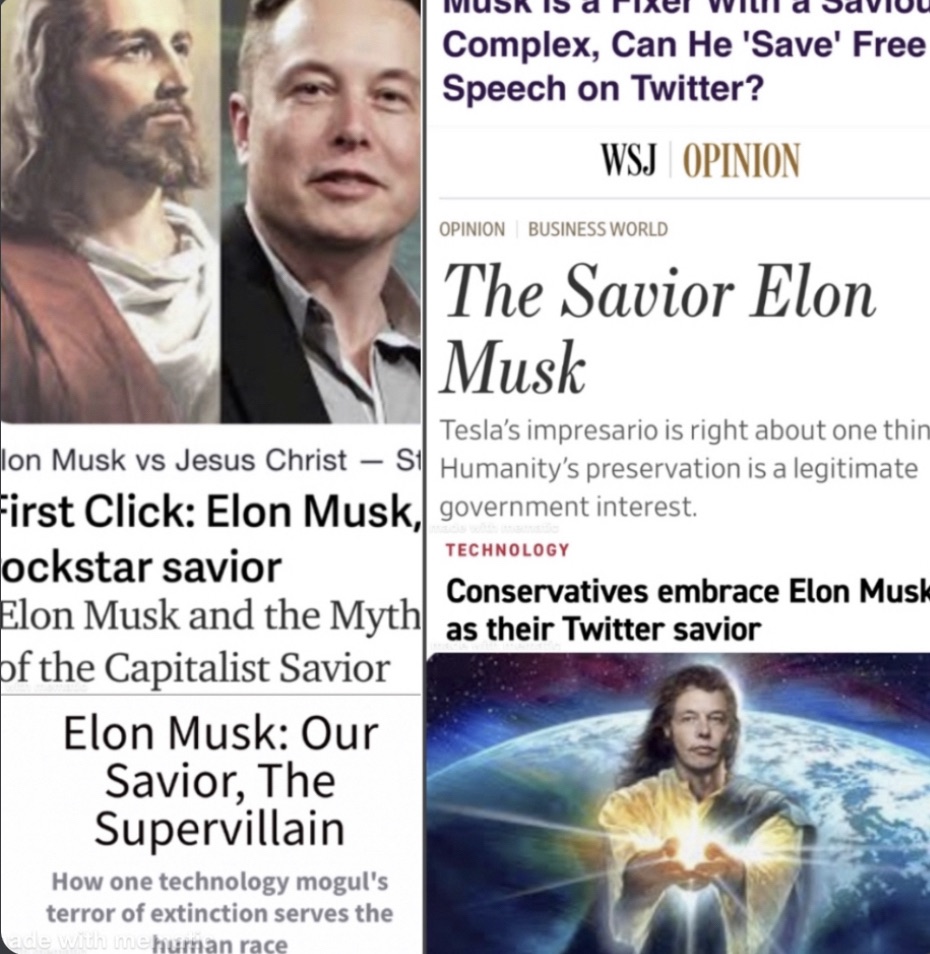Elon has been well documented as a sort of Rock-Star Messiah. XCorp and SpaceX to name a few. He owns Neurolink which has high hopes on saving people. The media has done some hinting on him as can be seen by this collage of article headlines.