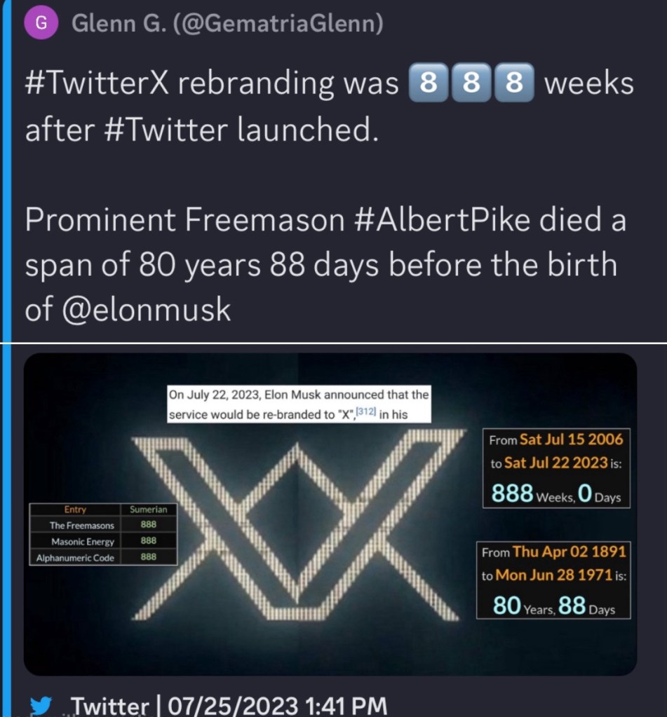 So the fact that the Twitter name was rebranded to X after 888 weeks is fitting to the messiah role connection to Elon Musk and X.