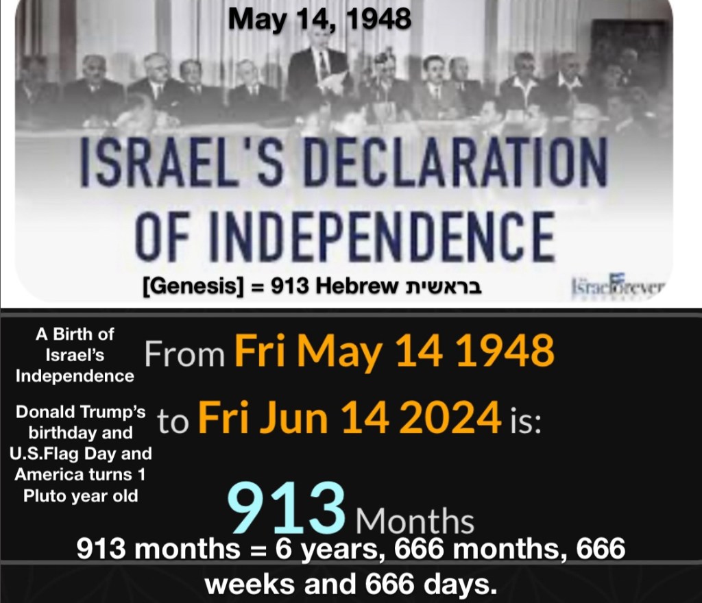 The Israel 913 months span is 6 years, 666 months, 666 weeks and 666 days. Emphasis on 6. The universe was created (the beginning) after 6 days of course. Genesis. Remember that in Hebrew Gematria, Genesis/Bereshit/ בראשית (In [the] beginning) = 913.