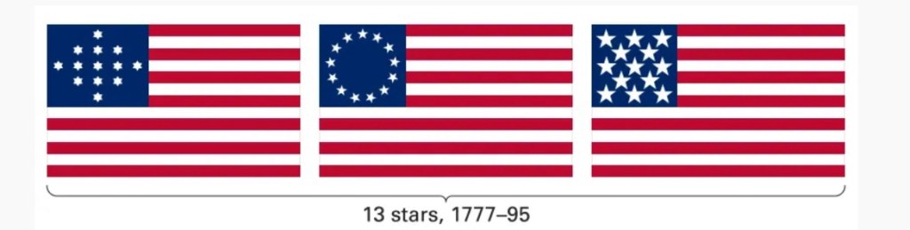 The Stars and Stripes are said to have represented the 13 colonies at the time. The most popular flag was probably the “Betsy Ross Flag” with the circle of stars.
