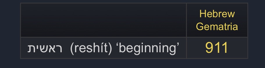 It should be noted while mentioning NYC’s 911 landmark that the Hebrew word ראשית (reshít) ‘beginning’ sums to 911… The word means the beginning in time, like a start of a movement.[2] Did the attacks on September 11 mark the end and beginning of something?