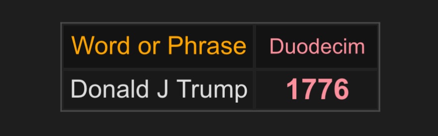 Another connection is in his birthday year. He turns 78 which is the 12th triangular number. There is a 12x multiplication cipher that I brought to light in the Gematria Connection server in 2022 which I dubbed Duodecim. It operates the same way as Sumerian which is 6x. Well, “Donald J. Trump” = 1776! Pretty neat connection to the birth year of the USA.