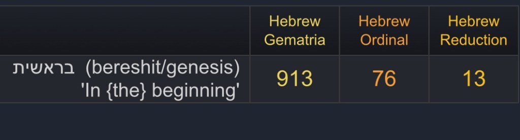 Btw the architectural height of One WTC is 1776 feet. The same word בראשית (b’reshit/bereshit), ‘In [the] beginning’ sums to 76 in Hebrew Ordinal and 13 Hebrew Reduction. It’s the word for Genesis, the biblical title of the first book that describes creation. Referring to Reason 1, 1776 was the year of the 13 colonies declaring independence and the beginning of the country.
