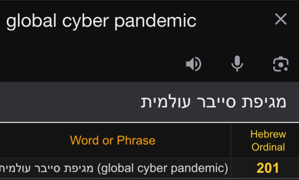 In 2020 Schwab described this future IT event as a “global cyber pandemic”. I was surprised to see that the term sums to 201 in Hebrew Ordinal!