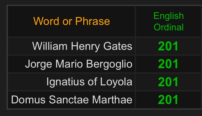 Some examples of 201 using the English Ordinal cipher are listed below. Remember that Pope Francis is the first Jesuit Pontiff. A cofounder of the Order is St. Ignatius of Loyola. The birth name of Pope Francis is Jorge Mario Bergoglio. He lives in Suite 201 in the Vatican apartments named Domus Sanctae Marthae.