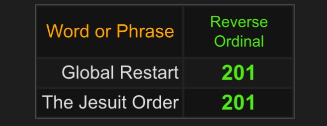 After some collaboration in the discord server I figured to make a post about some really interesting “numerical curiosities” with this event. I first raised an eyebrow when someone pointed out that this incident was happening on the 201st day of the year. A number seemingly conscripted/embraced by powers behind the curtains. 201 also has a pattern involving the Jesuit Order.