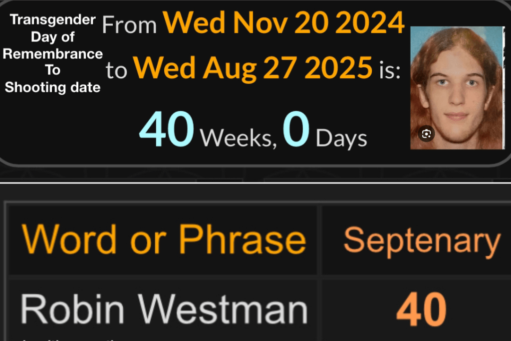 I saw 40 too. Again, maybe a coincidence but the shooting was 40 weeks since the last Transgender Remembrance Day. The guy’s name is Robin Westman which sums to 40 Septenary. 40 weeks is the time for human gestation, an amazing time span that only real women can experience first hand.