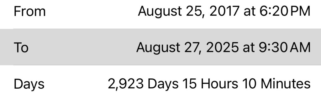 The trans shooter had written “kill Trump” etc on his rifle. So imagine that- exactly 99 moons before the shooting, on August 25, 2017, President Trump signed the memorandum banning transgender people from the military. [1]. I tried to be accurate with the date span by using initial reports of the signing [2] and the time of the shooting, using EST. Amazingly, the span is close to one exact Octaeteris, or 2923.5 days!