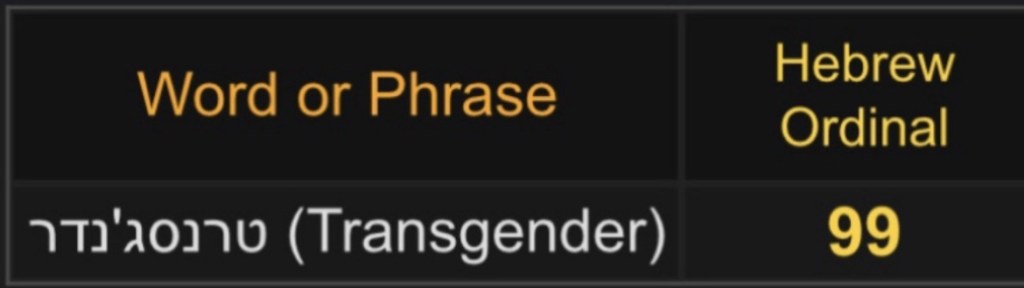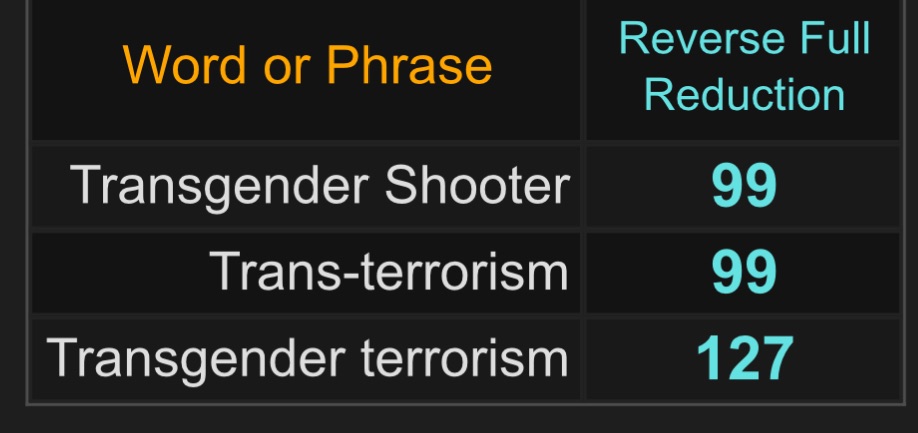 I identified a possible association with 99 when looking at the Covenant Presbyterian School Shooting in Nashville, Tennessee in March 2023. It was by another Trans shooter. Take a look at that blog post as it relates to this one. In Hebrew Ordinal, the word for transgender,טרנסג’נדר, sums to 99.